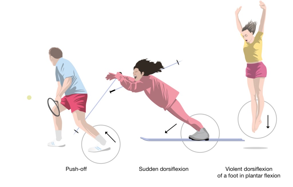 - Forcerad dorsalflektion av fotleden efter landningar från hopp: Detta sker främst vid fall eller hopp, exempelvis vid landning efter en nickduell i fotboll eller en smash i volleyboll.